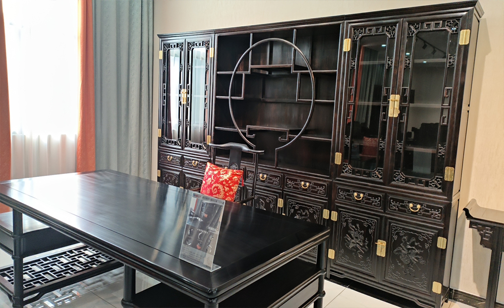 江蘇中尊木業(yè)有限公司書房系列產品:書房五件套草龍書柜、草龍大班枱、卷書寶座椅,洋花寫字枱等。